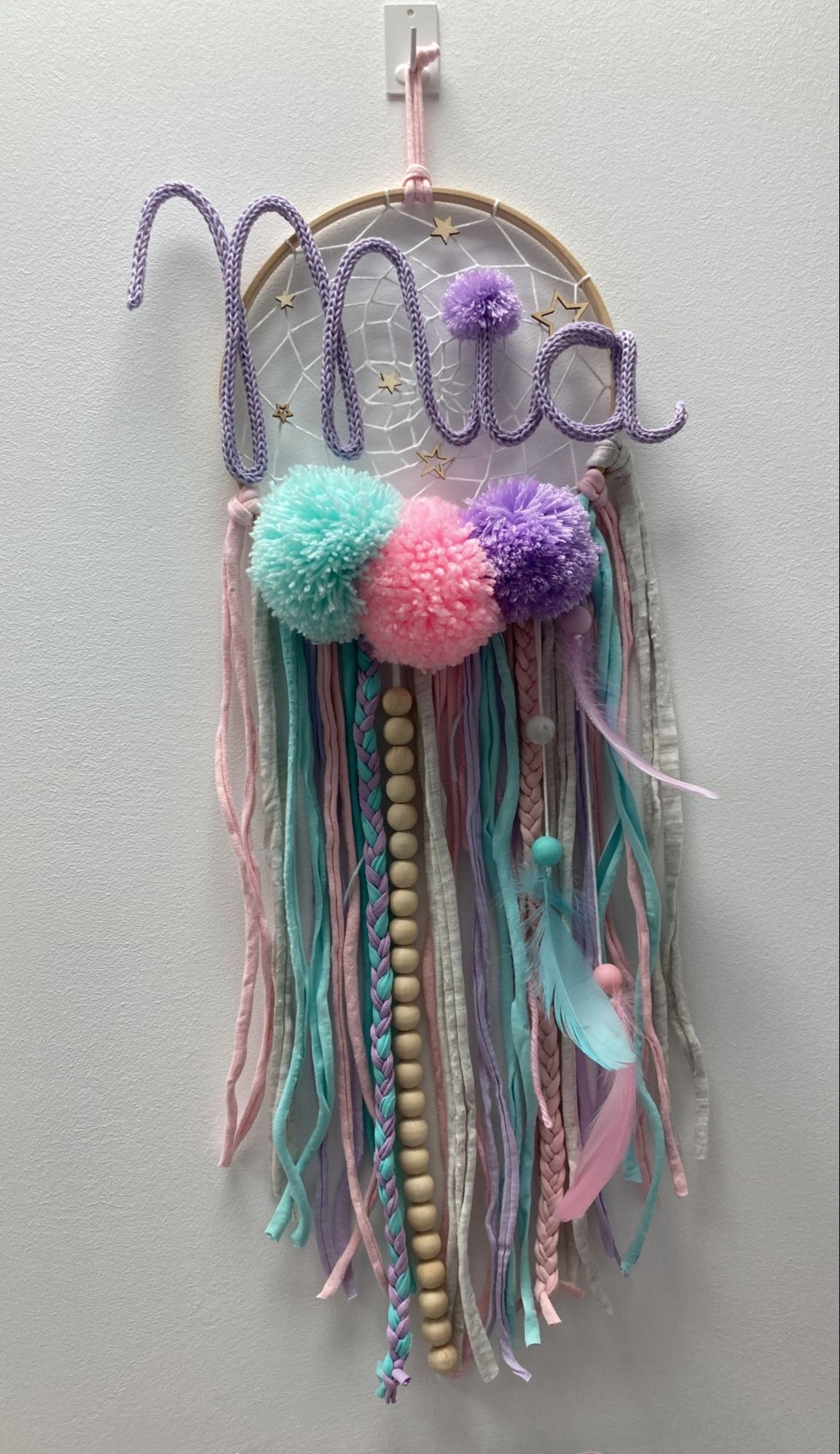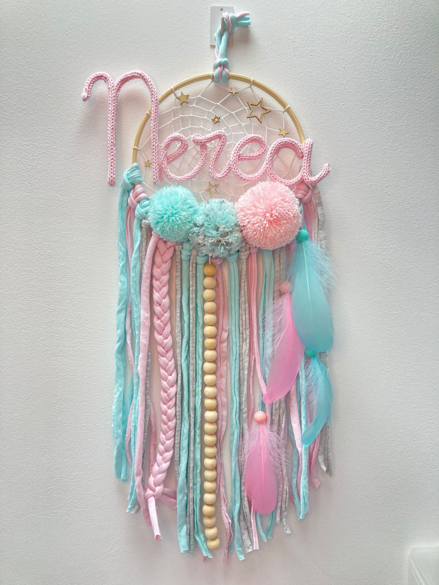 Atrapasueños modelo MIA con nombre tricotado. Diseñado con tejidos en tonos pastel y detalles en madera natural. Nombre y color del mismo totalmente personalizable. ¡Contáctanos!