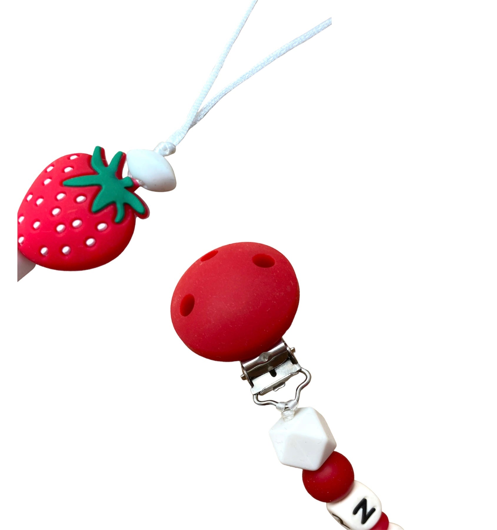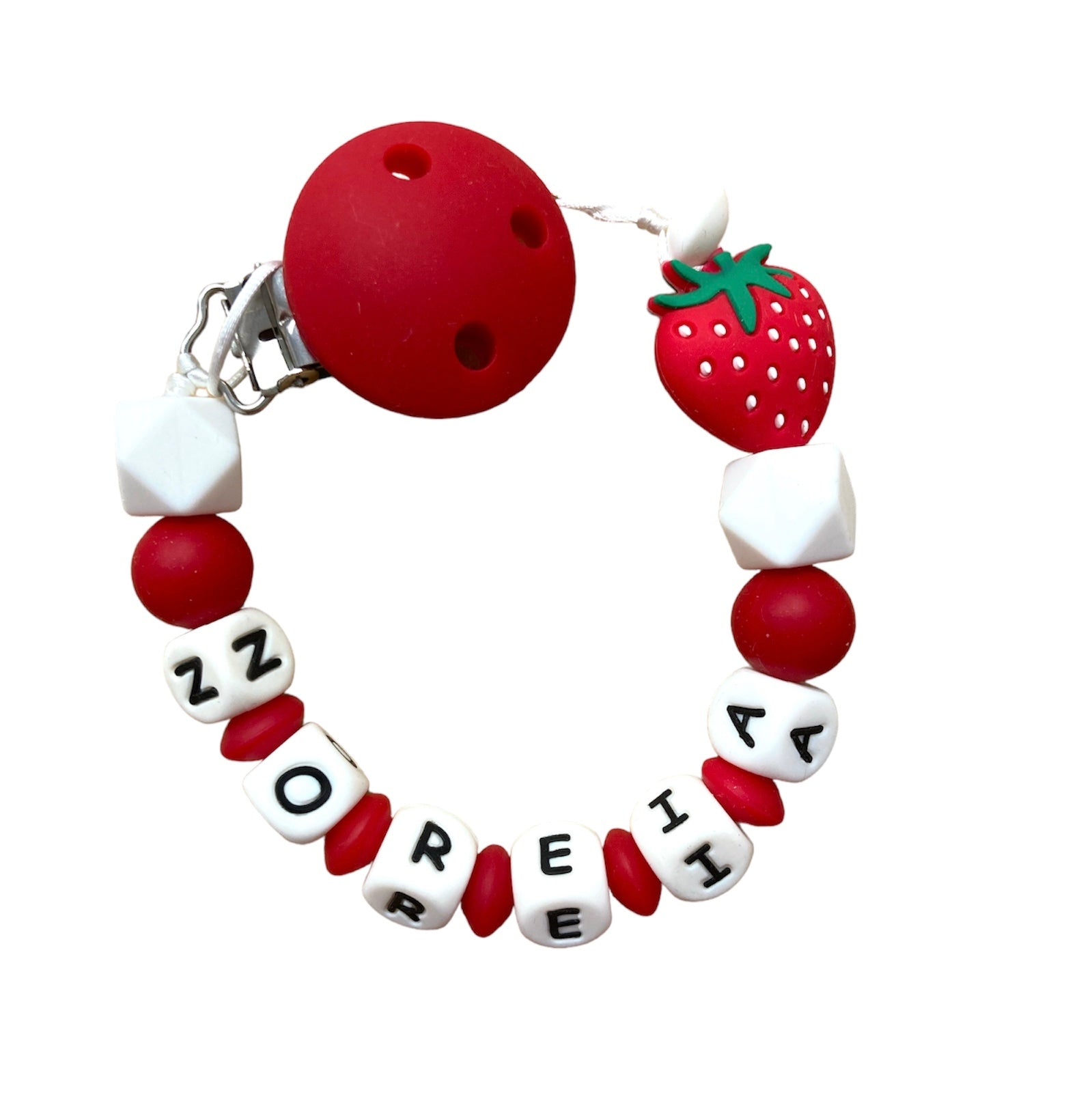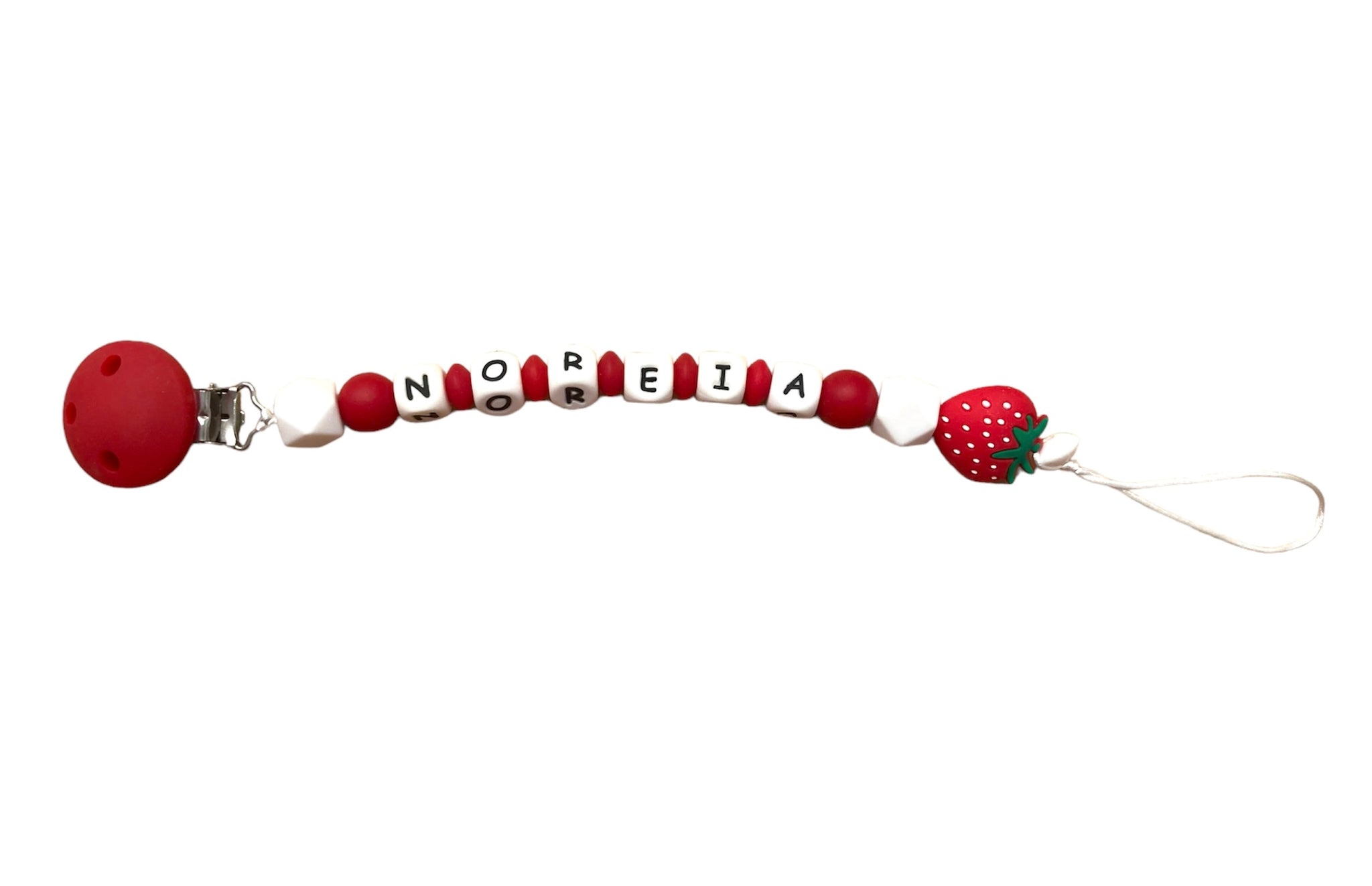 Chupetero modelo FRESA personalizable con el nombre deseado. Nos preocupa la seguridad de tu bebé, por lo que elaboramos nuestros chupe teros con Doble escuela y triple nudo de seguridad.
