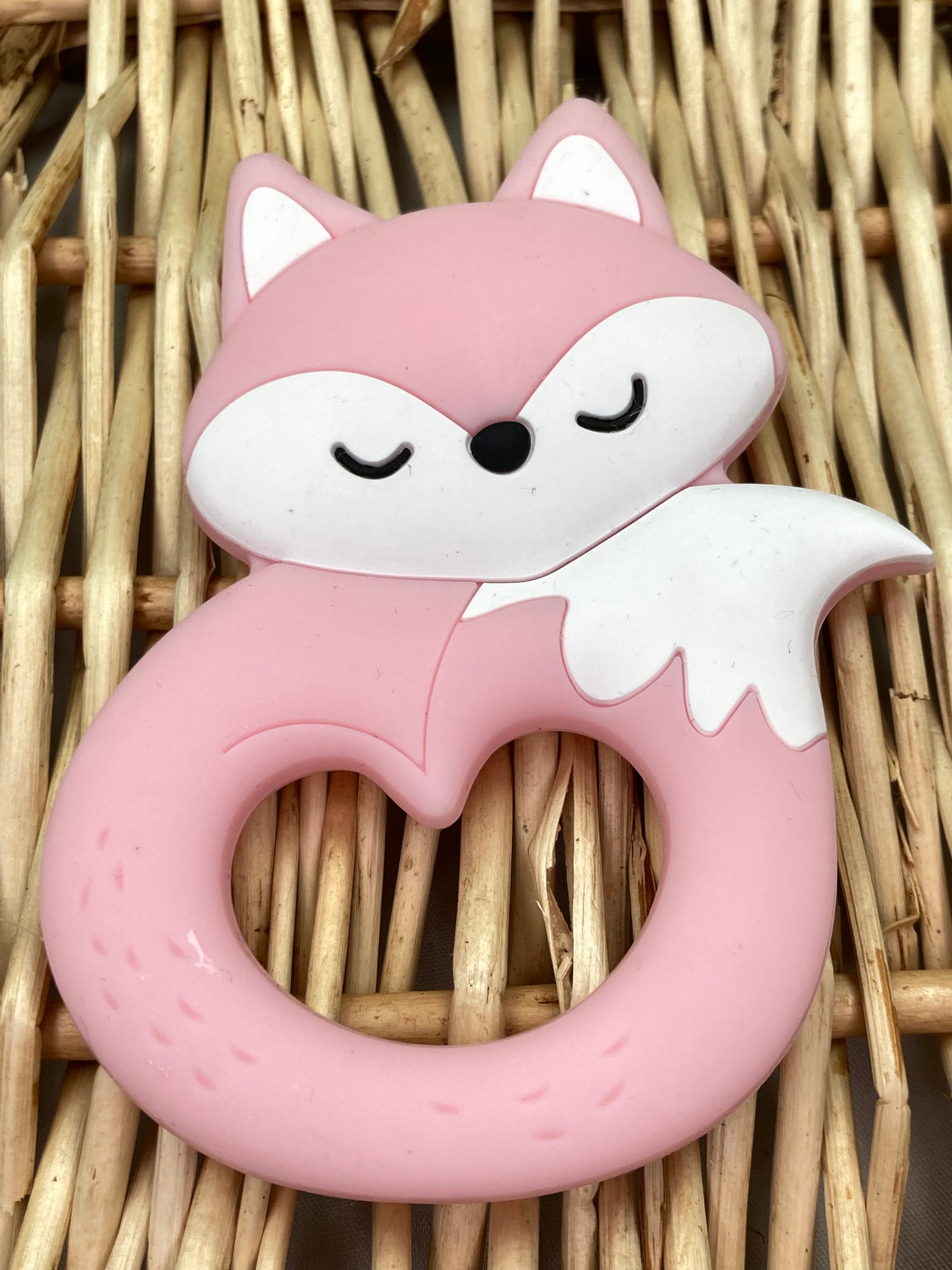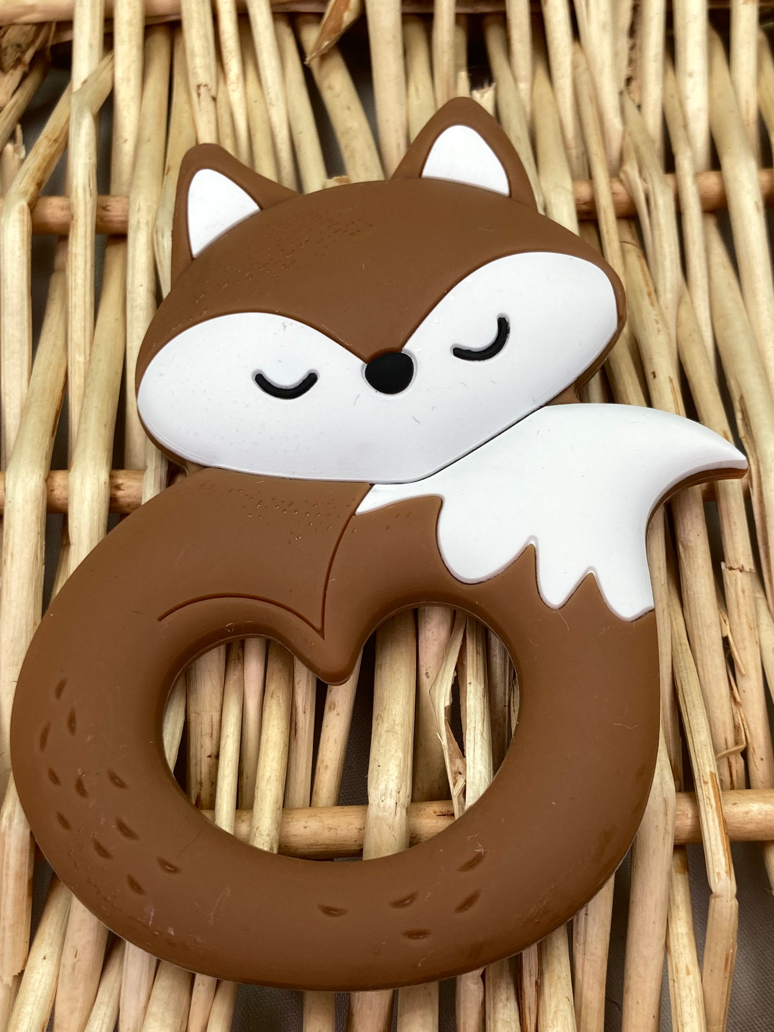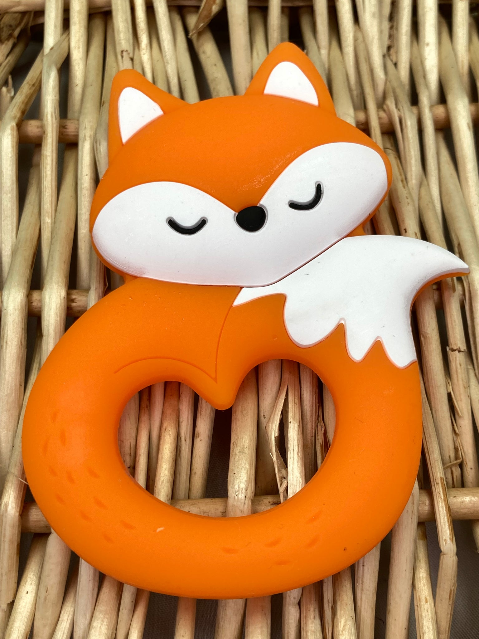 Mordedor para bebé en forma de adorable zorro, hecho de silicona de grado alimenticio. Juguete flexible para morder. Se puede meter en la nevera.